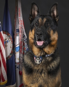 K-9 Atos, a brindle German Shepherd from Marburg, Germany, served with the Division from July 2011 to March 2018. Atos was certified by the Virginia Police Work Dog Association. Upon retirement, he lived at home with his K-9 handler.